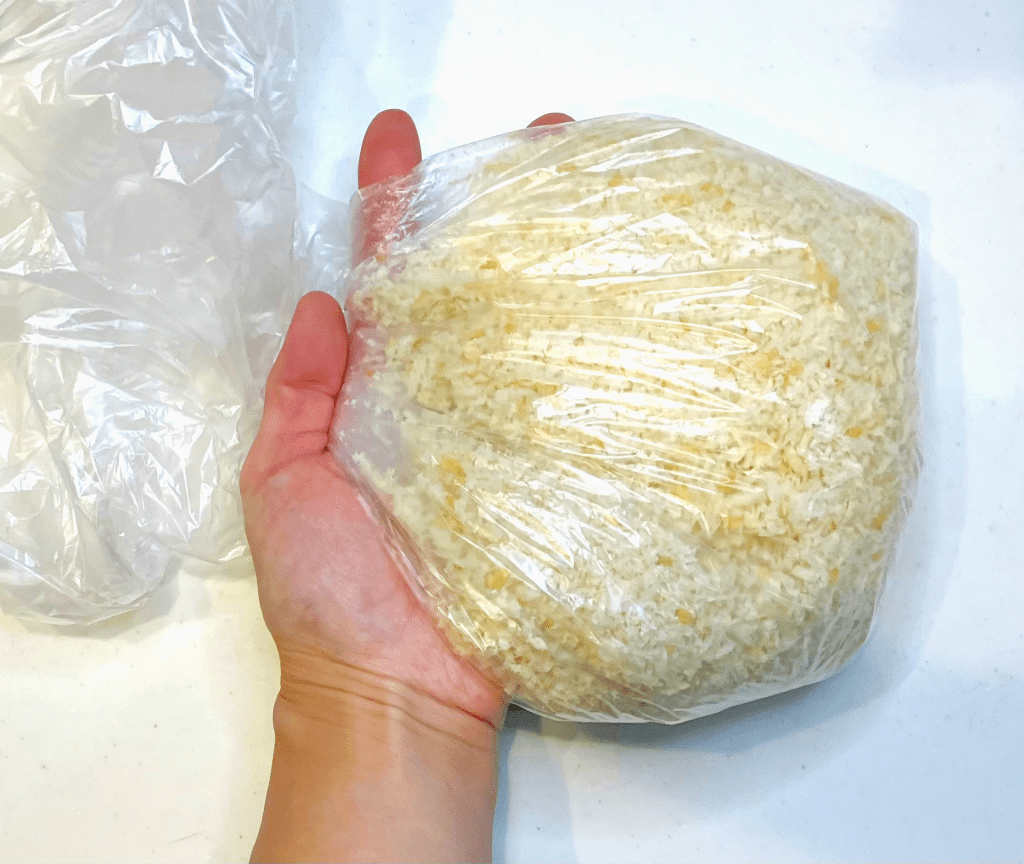 | ② ビニール袋にパン粉、カレー粉、切った鶏肉を入れ、よく振りパン粉をまぶす | ![]() |