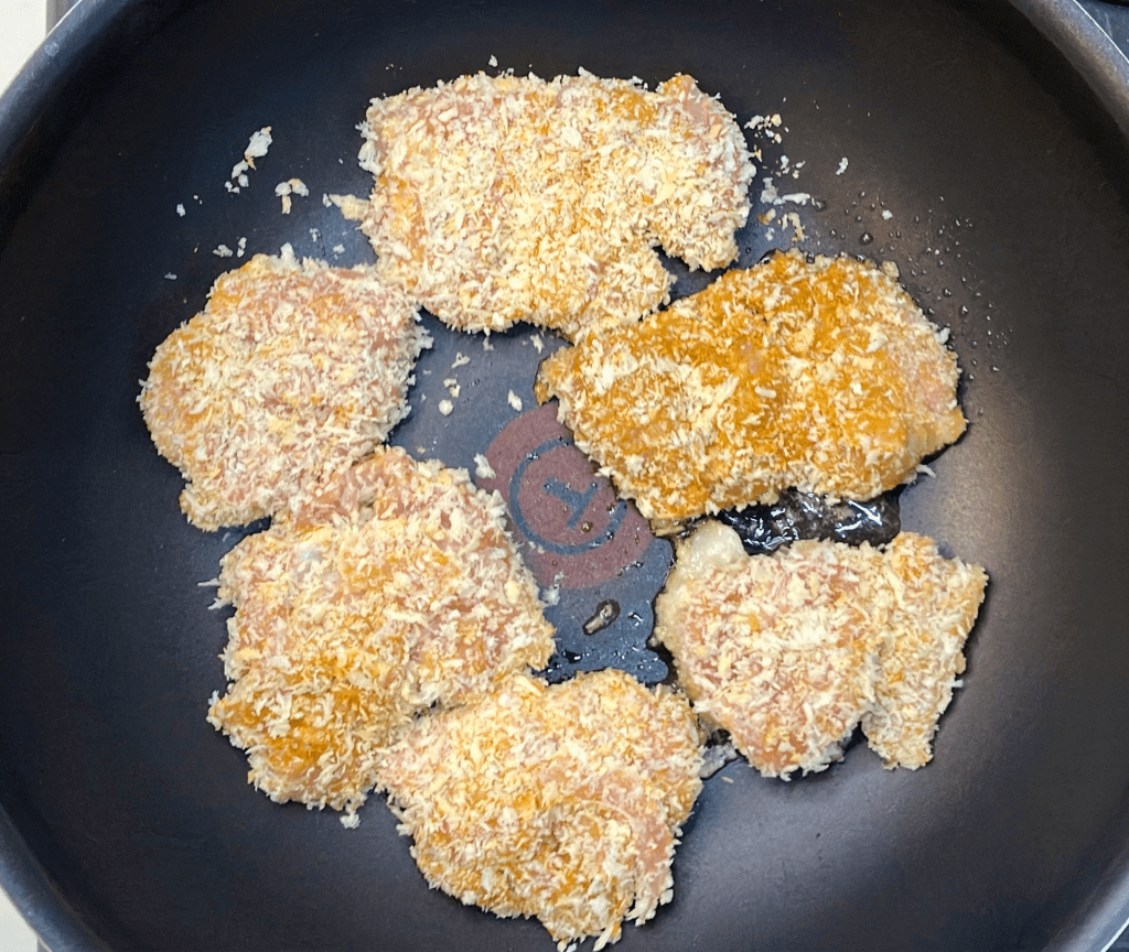 | ③ フライパンを中火で熱し、サラダ油を入れる パン粉を手で押さえてしっかり付けてからフライパンに並べて焼く | ![]() |