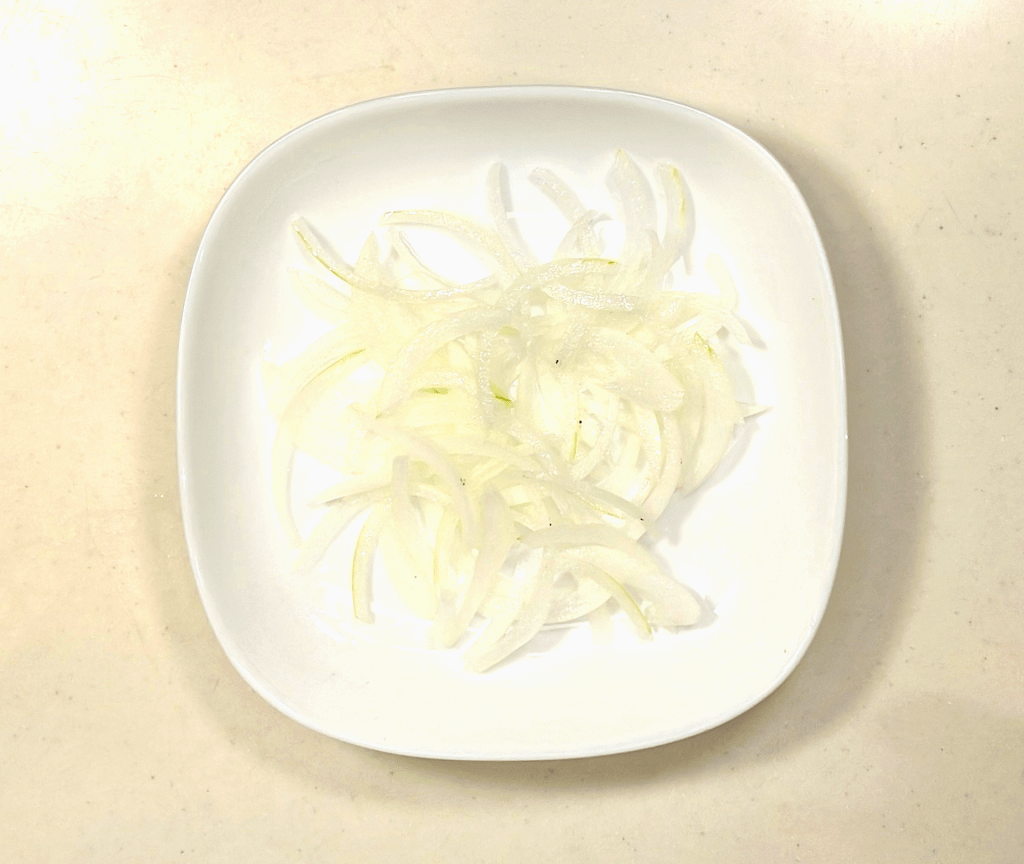 | ① 玉ねぎはスライスにしてお皿に並べておく | ![]() |