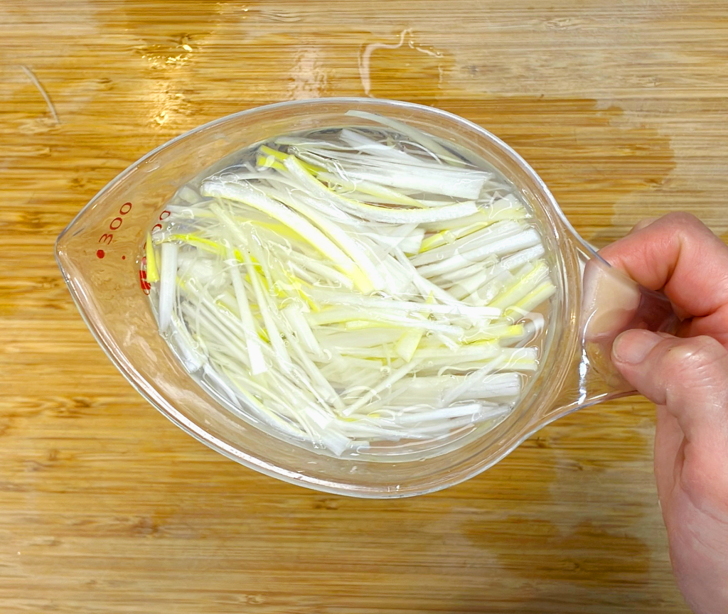 | ② 長葱は千切りにして水にさらして辛味を飛ばす | ![]() |