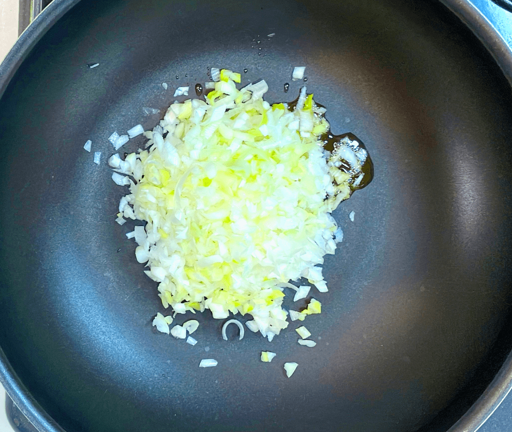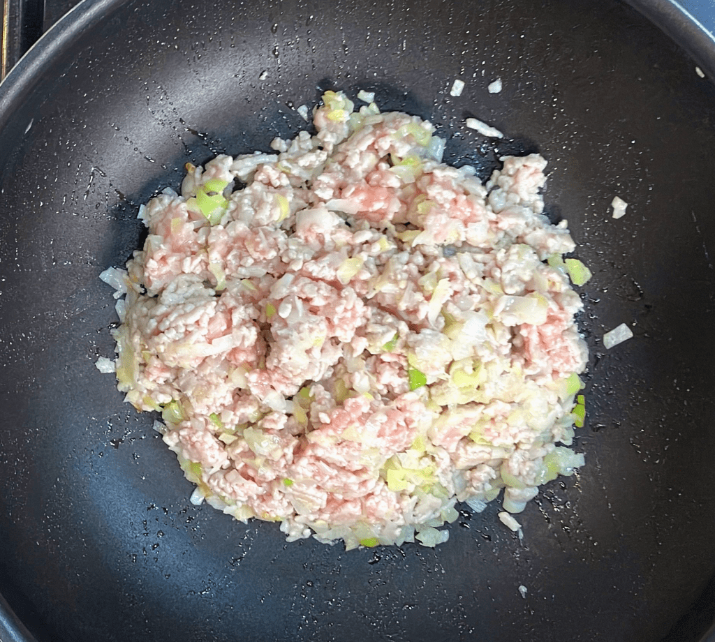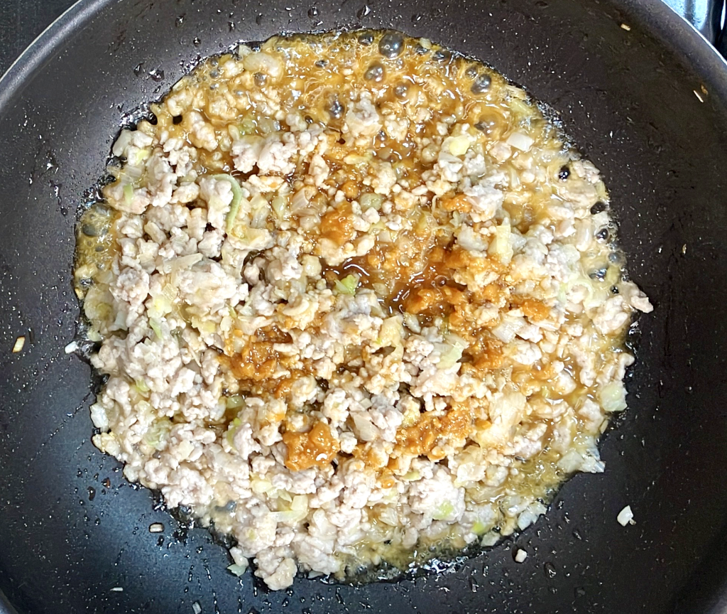 | ② 長葱または玉ねぎはみじん切りにして、ごま油で炒める | ![]() |