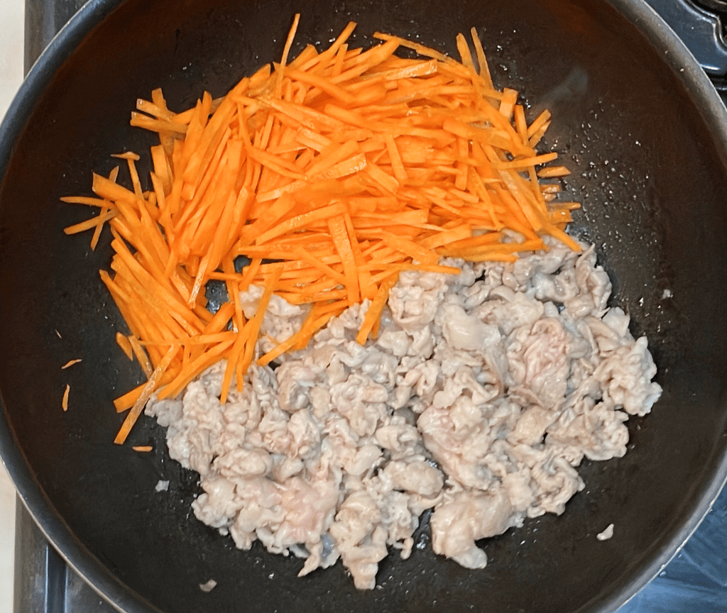 | ② フライパンにごま油大匙1とにんにくを入れて火をつける。香りが出てきたら豚肉を入れ、火が通ったら人参も入れて炒める | ![]() |
