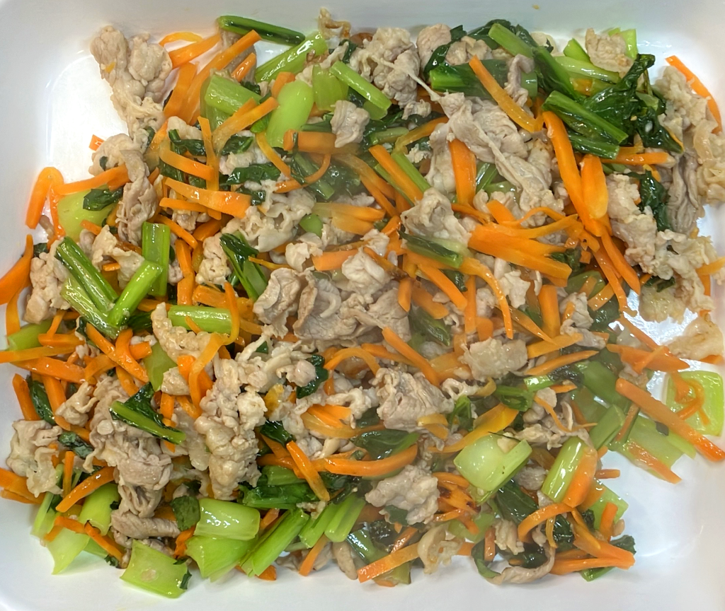| ① 豚肉は一口大に切り、小松菜は3cm幅に、人参は千切りにする | ![]() |