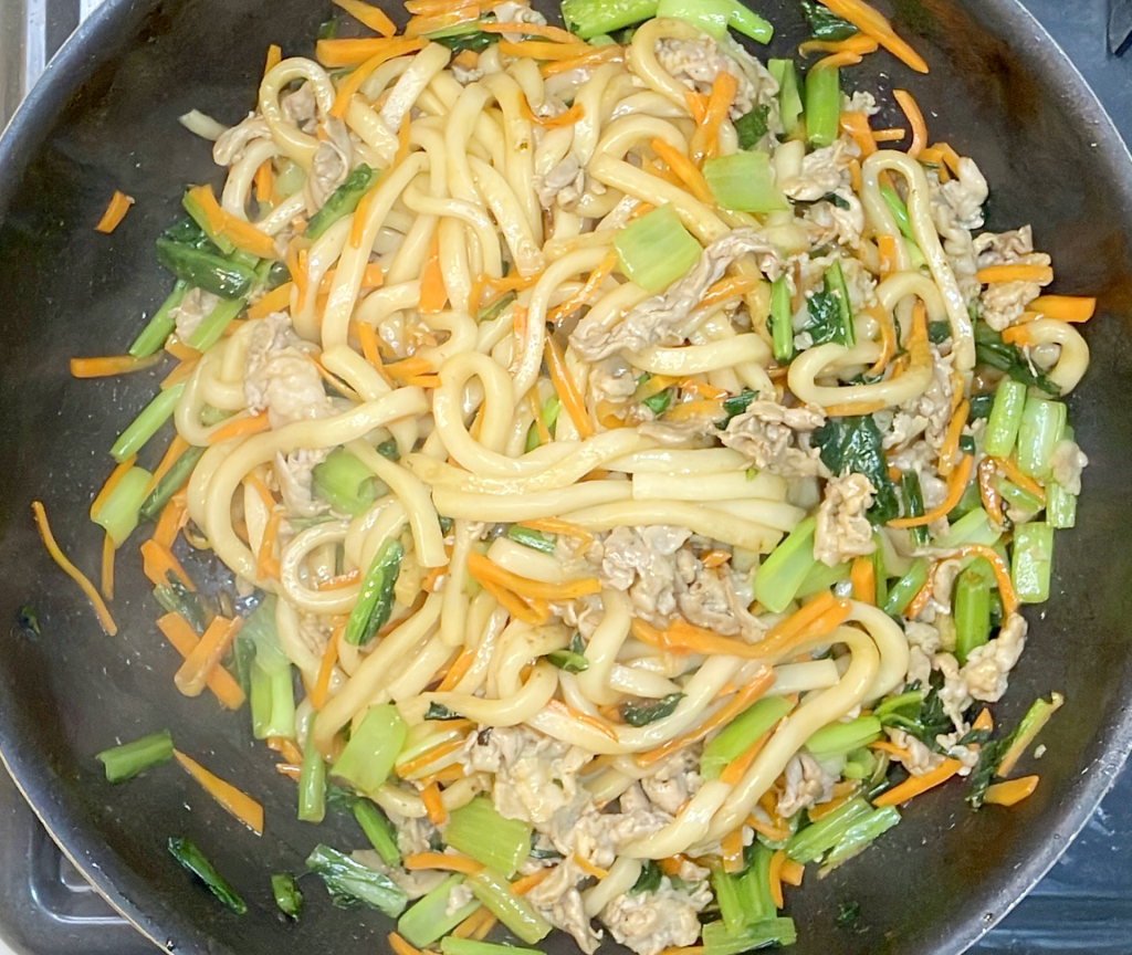冬に旬を迎える小松菜を使い、豚肉とにんにくのパワーで疲労回復にピッタリな一品です。今回は茹でうどんを使いましたが、冷凍うどんを電子レンジで加熱して使っても良いと思います。