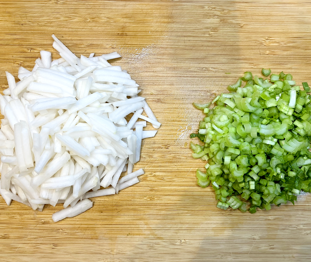 | ① かぶは太めの千切り、かぶの葉は小口きりにする | ![]() |