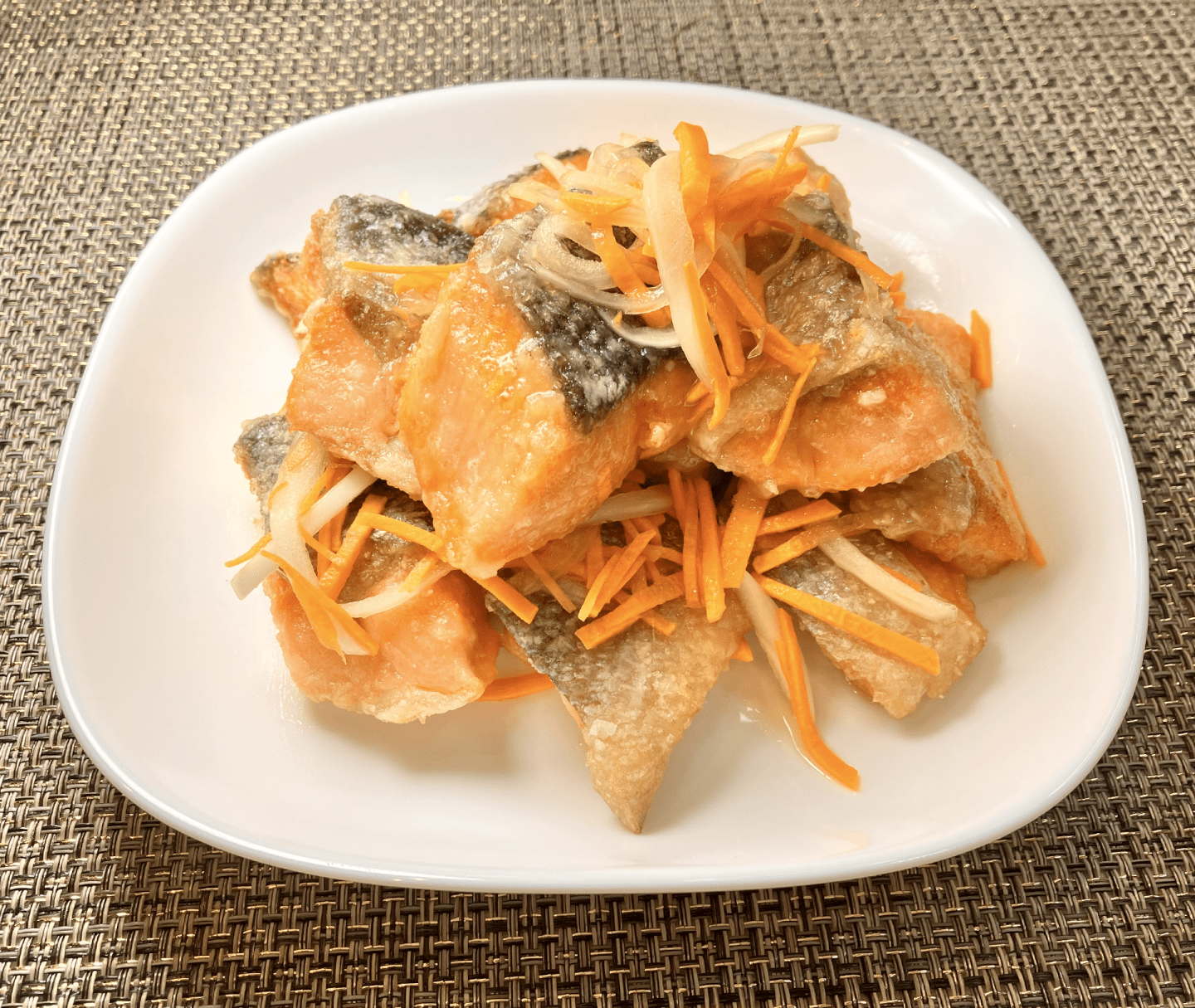 出来立てもおいしいですが、一晩冷蔵庫に入れて味を馴染ませて食べることもおすすめです。今回はカミカミメニューとして、鮭の余熱だけで野菜に火を入れていますが、生の野菜や酸味が苦手な方は、切った野菜と合わせ調味料を耐熱容器に入れて電子レンジで火を通すと食べやすくなりますよ。