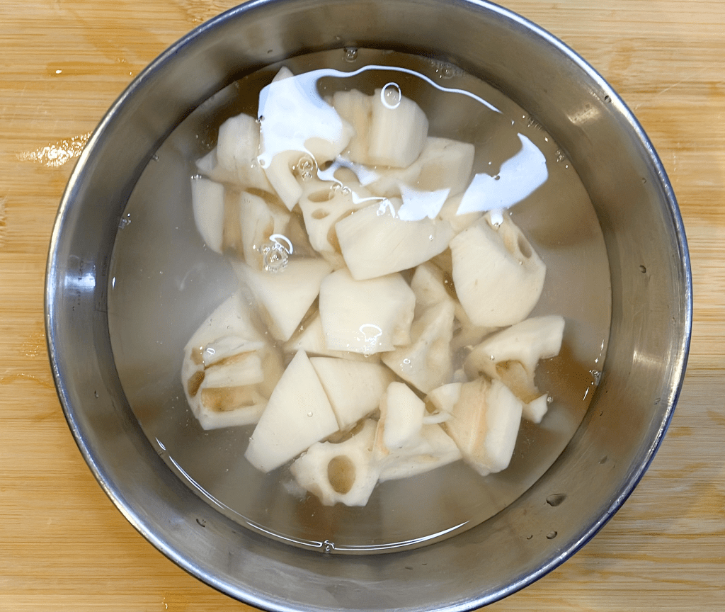 | ① れんこんは乱切りにし、水につけておく | ![]() |