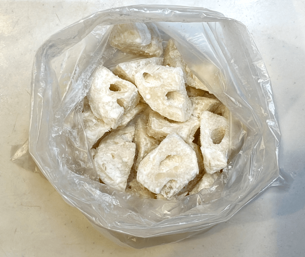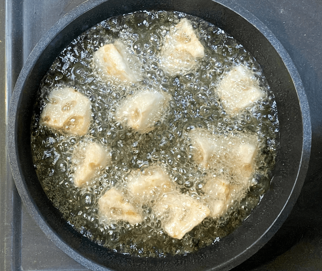 揚げ焼きするときは小さめに切った方が火の通りが良いですが、普通に揚げる場合はぜひ大きめに切って食感も楽しんでいただけたらと思います。