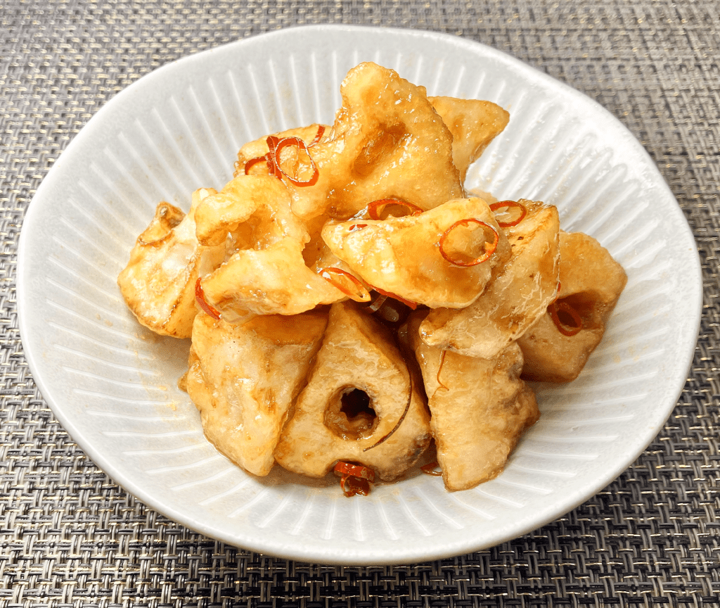 れんこんはでんぶん(糖質)、ビタミンC、食物繊維を多く含んでいます。切ったあとは変色を防ぐために水や酢水に入れたりしますが、ビタミンCは水に溶けて流れ出やすいため水に入れるときは短時間にしましょう。