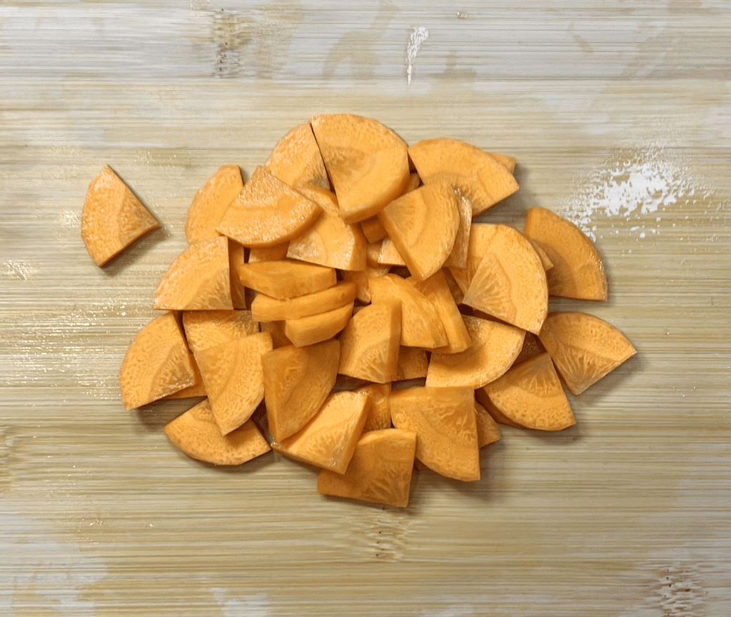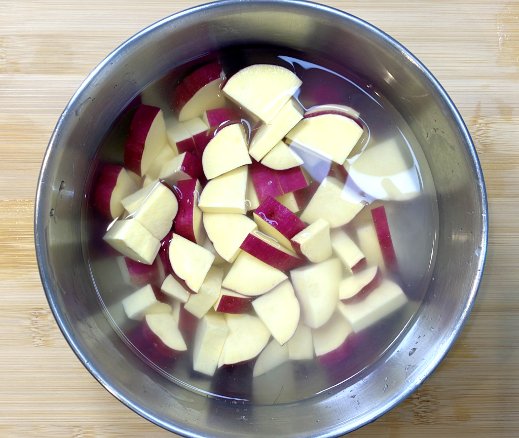 | ② さつまいもは厚めのいちょう切りにし水にさらしてアクを抜く。5分電子レンジで加熱する | ![]() | |