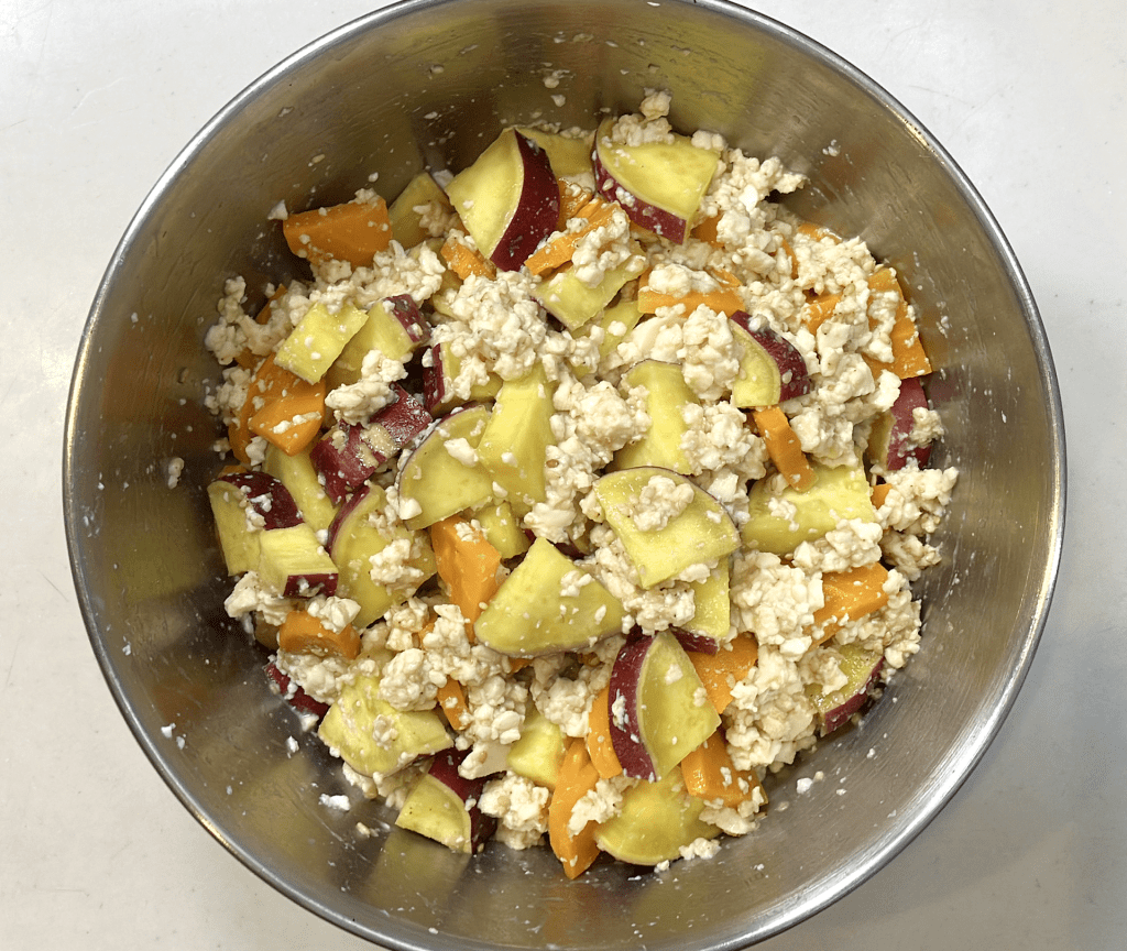⑤ | ④のさつまいもと人参を加え、よく混ぜる ![]() |