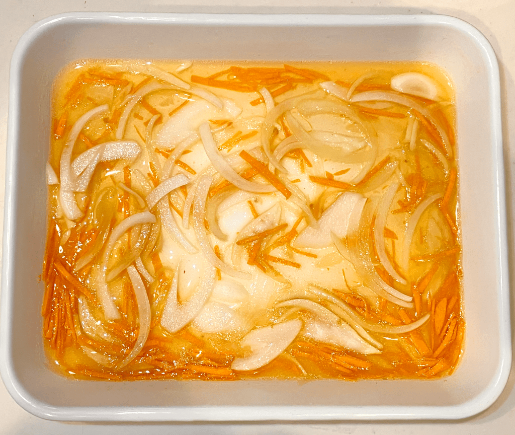 出来立てもおいしいですが、一晩冷蔵庫に入れて味を馴染ませて食べることもおすすめです。今回はカミカミメニューとして、鮭の余熱だけで野菜に火を入れていますが、生の野菜や酸味が苦手な方は、切った野菜と合わせ調味料を耐熱容器に入れて電子レンジで火を通すと食べやすくなりますよ。