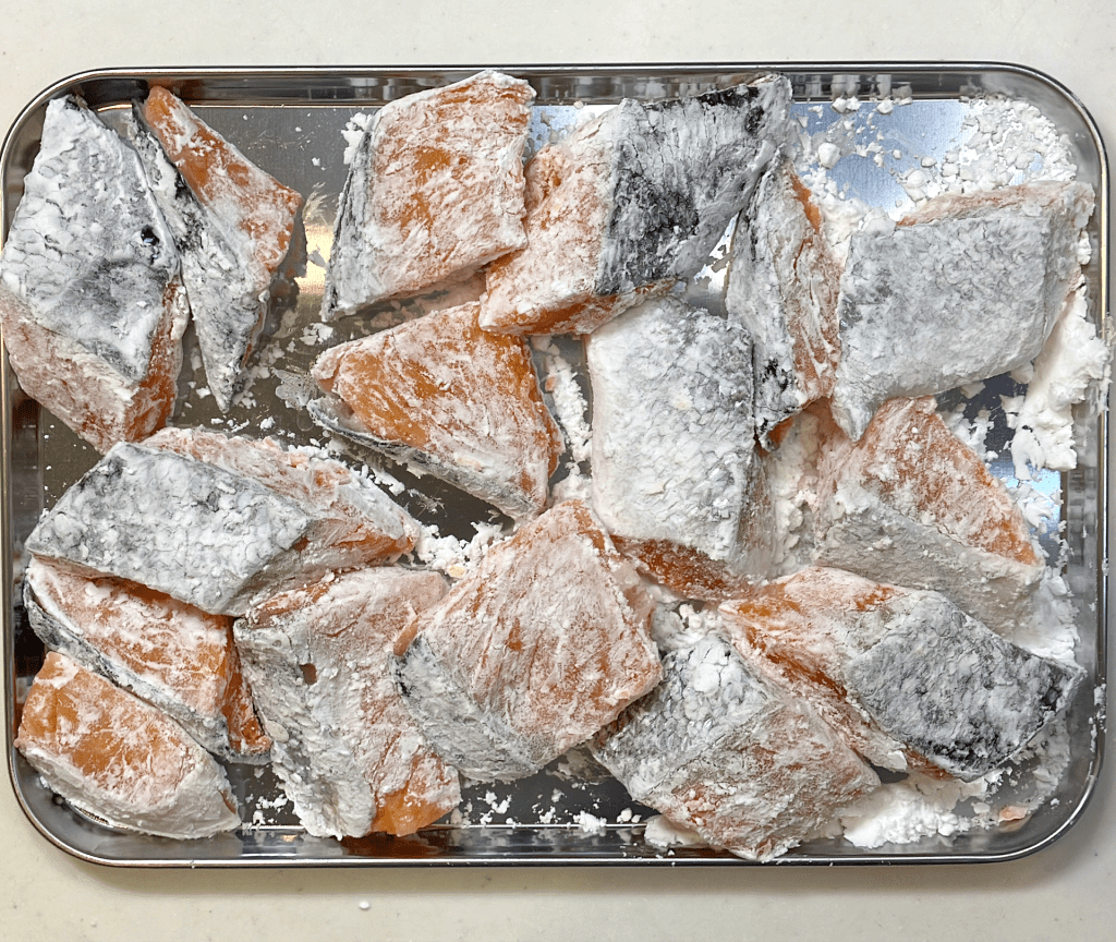③ 鮭の切り身を4等分し、片栗粉をまぶす | ![]() | |